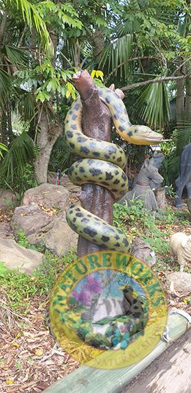 Crafted with incredible detail, this snake replica has been custom-painted to reflect the patterns of the modern-day anaconda snake. This Anaconda python has been poised in a striking pose wrapped around a tree stump.